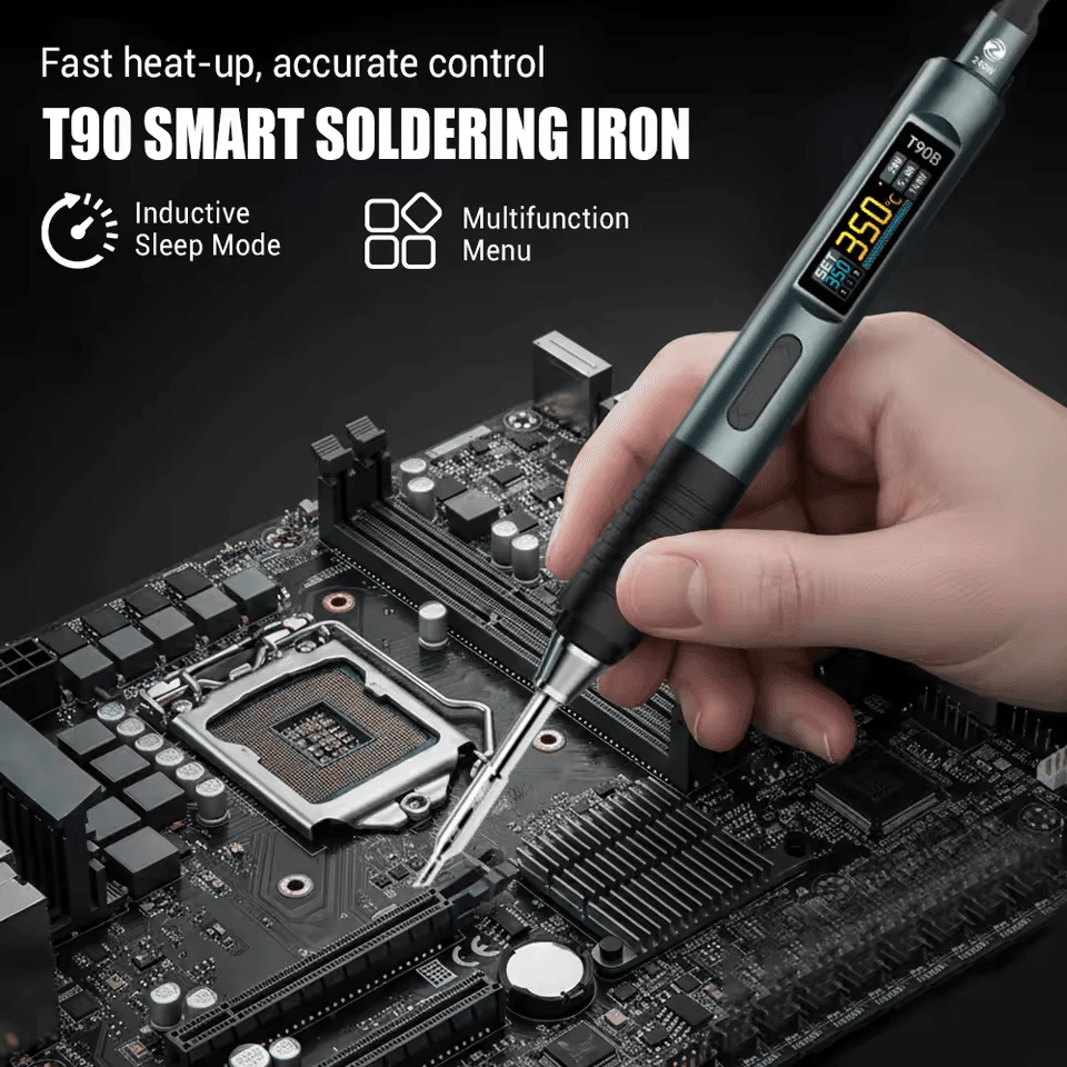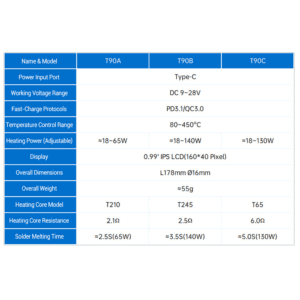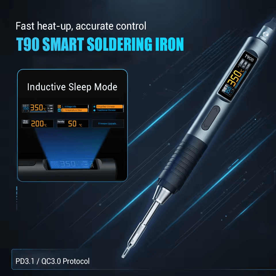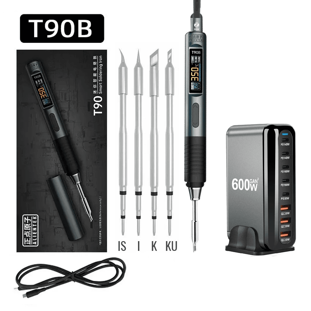 Электрический паяльник ALIENTEK T90B – это усовершенствованный инструмент для точной пайки. Эта модель включает поддержку протокола PD3.1, увеличенную выходную мощность до 140 Вт и 0.99-дюймовый ЖК-дисплей IPS. В нём реализована технология адаптивного управления питанием, которая автоматически определяет максимальную мощность подключенного источника питания для эффективного нагрева. Дополнительные функции включают измерение тока, быструю регулировку температуры и различные функции защиты для обеспечения безопасной и надежной работы.