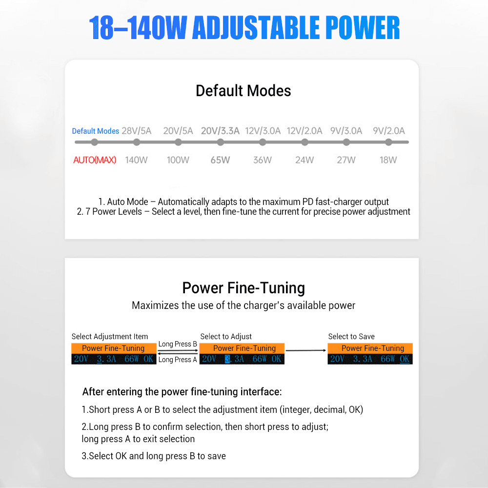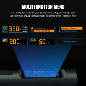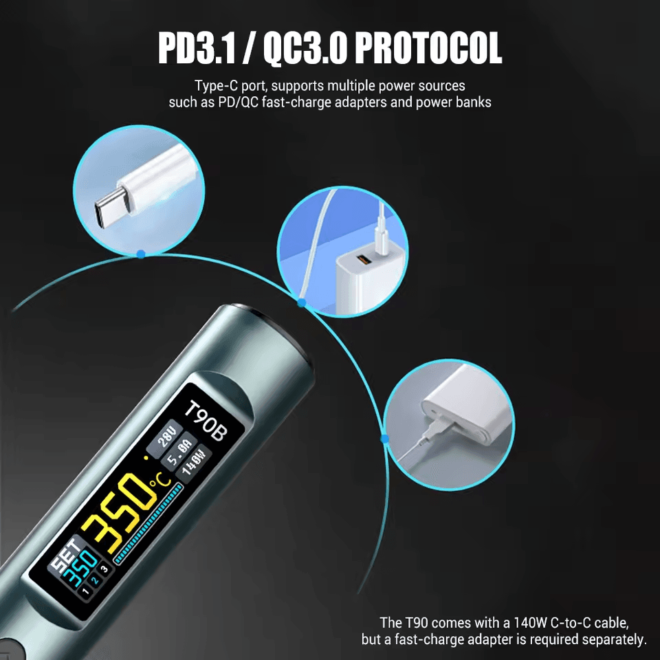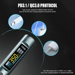 - Высокая мощность и быстрый нагрев: Выходная мощность 140 Вт (макс.) с поддержкой протокола PD3.1, что позволяет производить быструю плавку олова всего за 3 секунды.