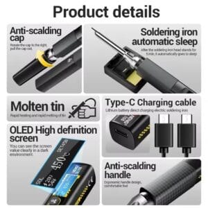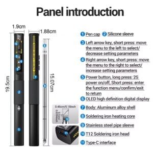 - Цифровой OLED HD дисплей с диагональю 0,8″ (128*32 пикселей) отображает параметры с большим диапазоном регулировки температуры (100-450 °С), что делает этот паяльник незаменимым помощником при выполнении работ, связанных с ремонтом электроники.