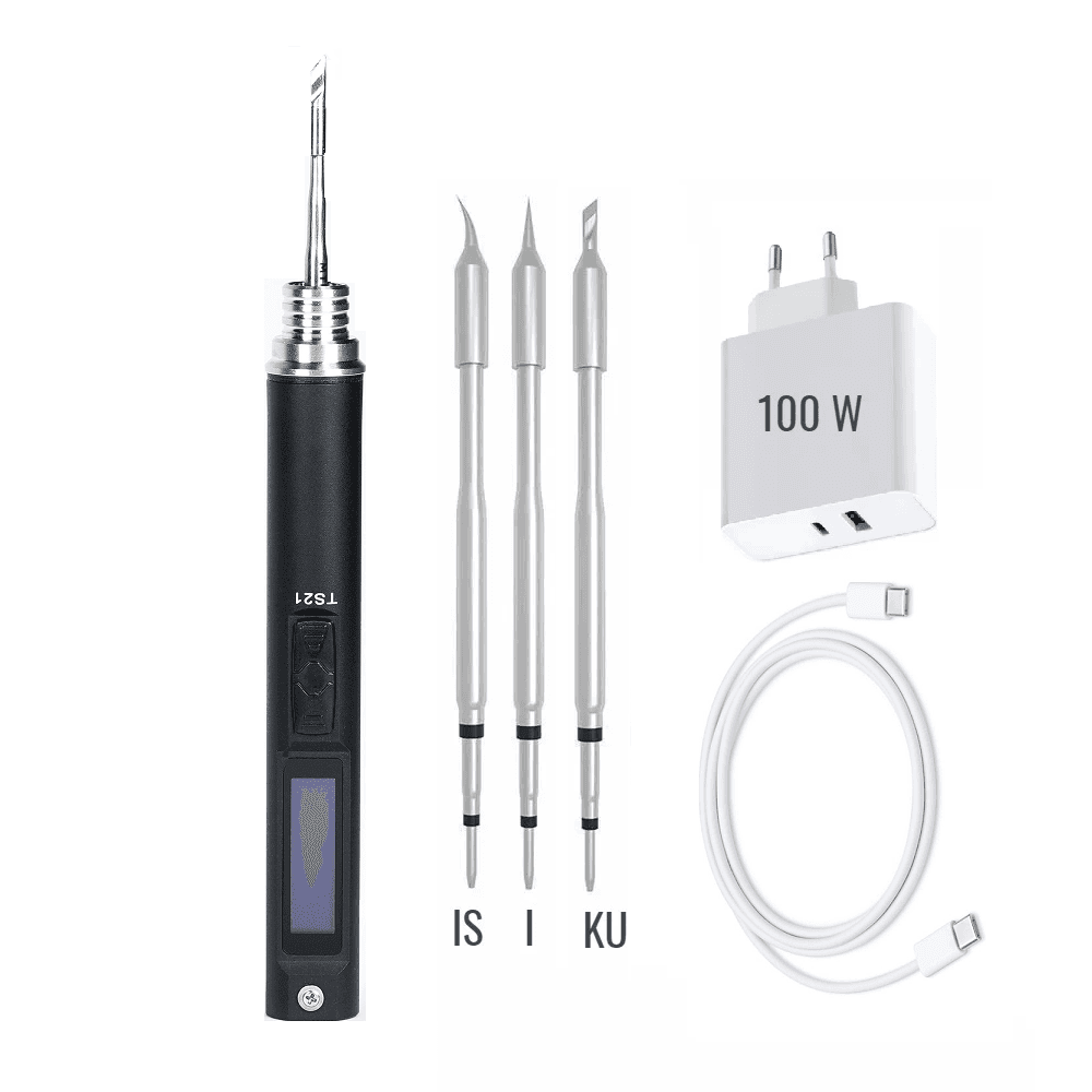- Комплектация с блоком питания: паяльник TS21, жала сменные KU,IS,I, термоусадочный силиконовый “рукав” 3 шт, инструкция на английском, болок питания 100W GaN PT102, кабель Type-C для питания.