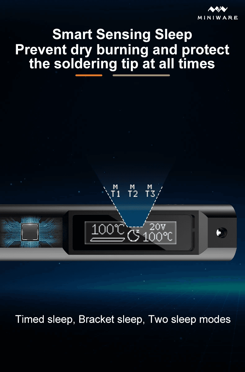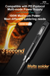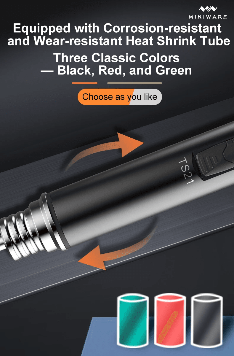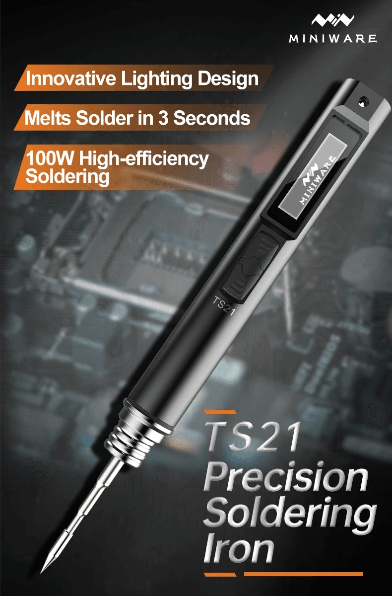 Miniware TS21 — это точный портативный цифровой паяльник с регулируемым контролем температуры, разработанный для профессионалов и любителей электроники. Благодаря мощности нагрева до 100 Вт и поддержке быстрой зарядки через USB Type-C (PD 2.0) устройство быстро нагревается и может питаться от внешнего аккумулятора или зарядного устройства для смартфона.