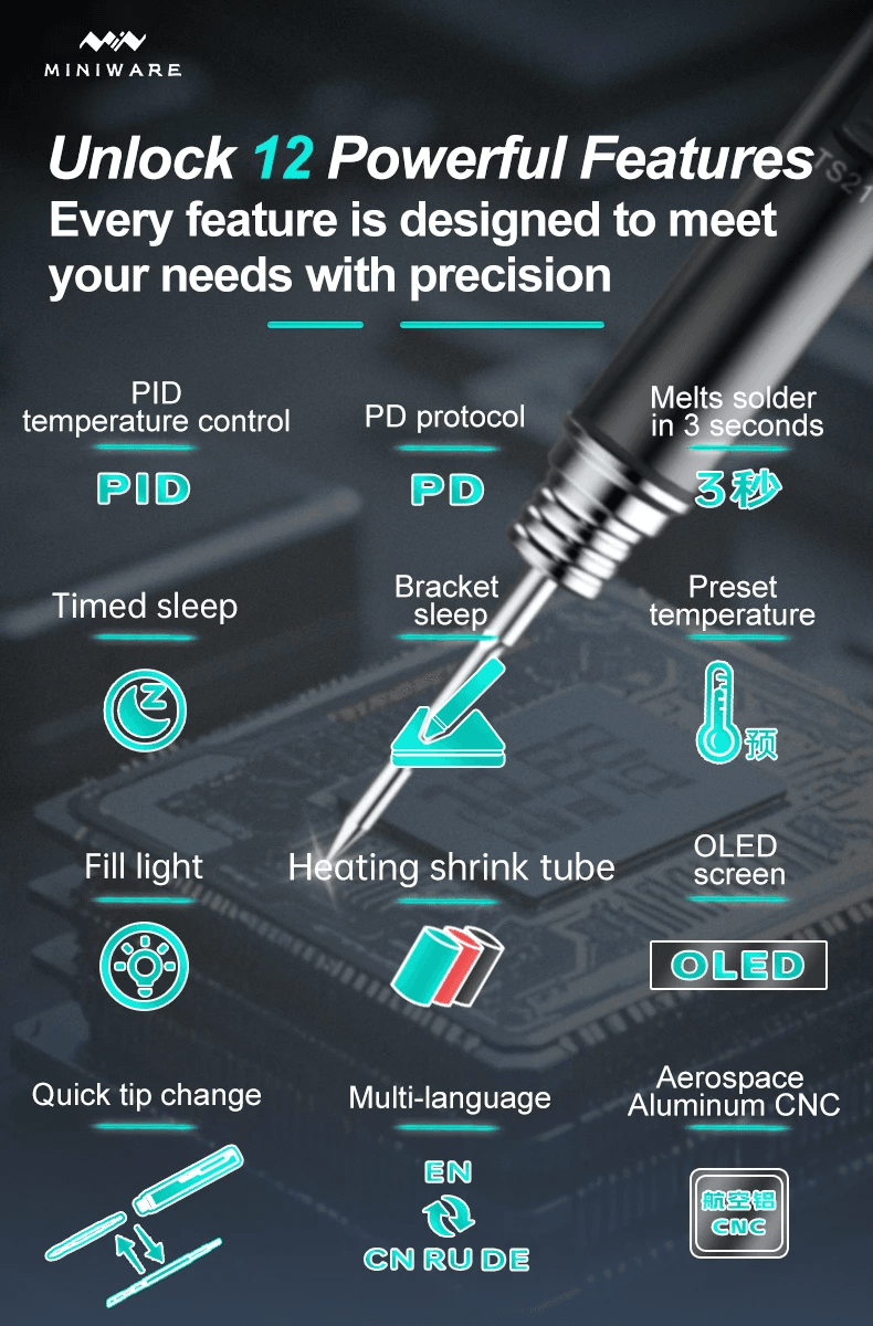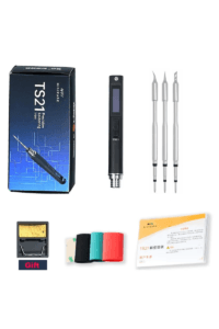 Паяльник совместим с наконечниками серии C210 и оснащен OLED-дисплеем, на котором отображаются основные рабочие параметры. Его компактная форма и корпус из алюминиевого сплава, обработанный на станке с ЧПУ, обеспечивают удобство в обращении и прочность конструкции. Кроме того, устройство оснащено встроенной светодиодной подсветкой, которая помогает в выполнении точных работ, и акселерометром, который автоматически переводит паяльник в спящий режим, когда он не используется. TS21 позволяет обновлять прошивку и настраивать конфигурации через компьютер. Благодаря широкому диапазону температур от 100 до 450 °C и быстрому нагреву паяльник идеально подходит как для мелкого ремонта, так и для более сложных паяльных работ.