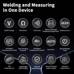 - OLED-дисплей на лицевой стороне корпуса четко отображает все рабочие параметры, включая текущую температуру паяльника, выбранные режимы мультиметра и уровень заряда аккумулятора.