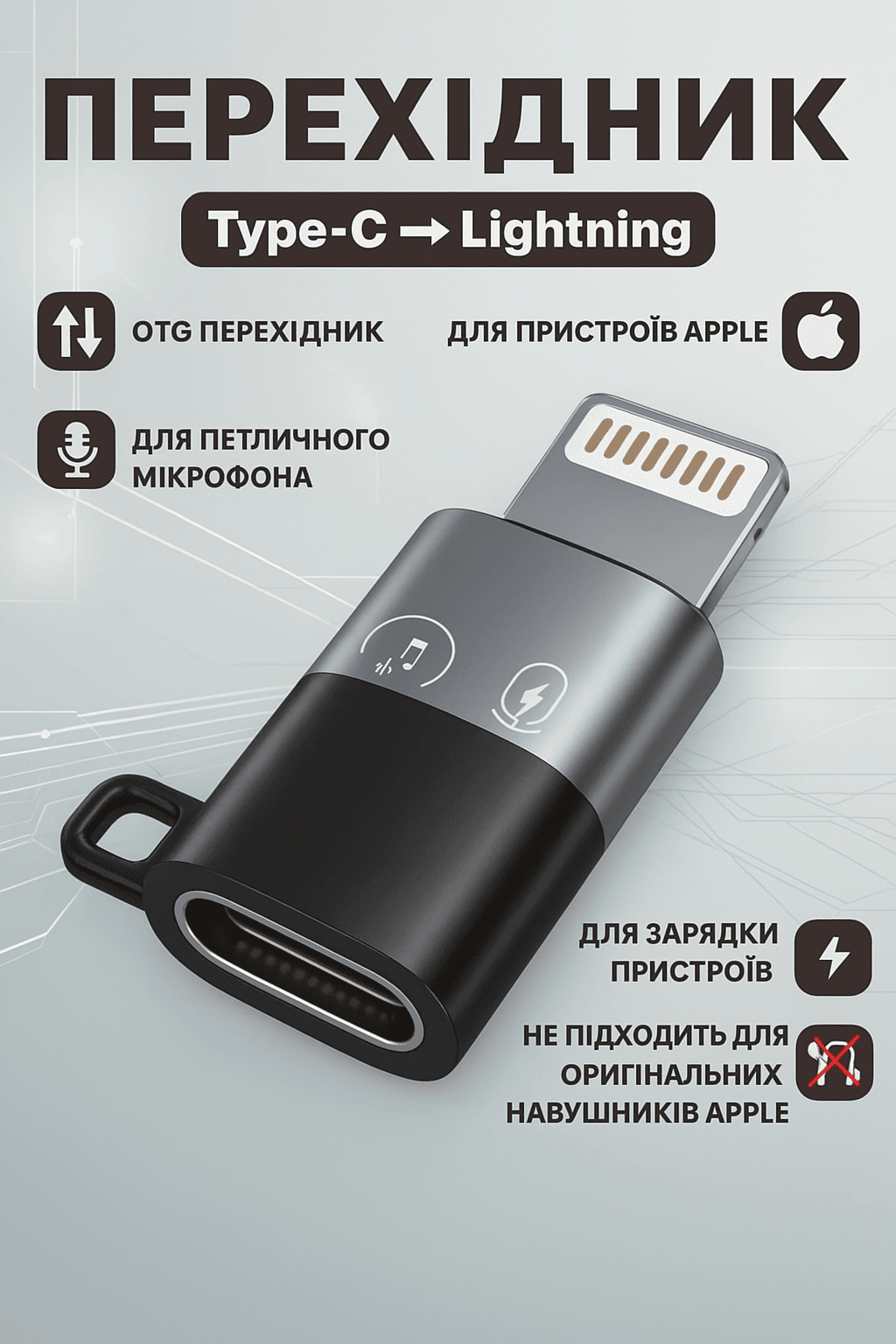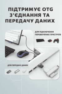 Адаптер OTG – переходник, предназначенный для подключения к устройствам с разъемом Lightning кабелей, петличных микрофонов, наушников или других устройств с коннектором Type-C. Используется для синхронизации и зарядки, поддерживает силу выходного тока 2,4 А.