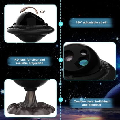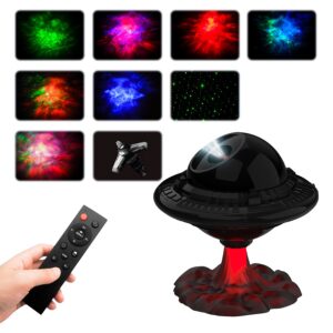 Лазерный проектор галактики НЛО имеет 9 потрясающих эффектов освещения – они сочетают галактические туманности, мерцающие зеленые звезды и даже космический корабль. Направьте его на стену или потолок вашей комнаты, и он создаст особенную атмосферу для просмотра фильмов, свиданий или игр. Также станет замечательным ночником для детской комнаты.