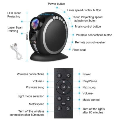 Особенностью этой модели проектора является то, что она совмещает функции лазерного проектора и Bluetooth колонки с аккумулятором, что делает её более портативной. Вы можете подсоединить её к ПК и управлять музыкальными треками и режимами свечения с помощью пульта дистанционного управления. Также у проектора есть специальный музыкальный режим. В нем изображение космоса будет мигать в ритм музыке. Эта функция сделает любую вечеринку яркой, атмосферной и незабываемой!