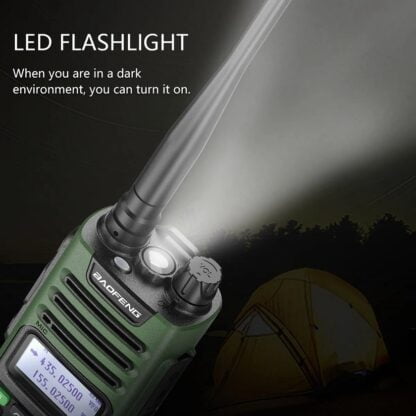 Функция VOX позволит вести передачу без помощи рук. Аккумуляторная батарея ёмкостью 8800mAh обеспечивает длительное время работы радиостанции. Количество ячеек памяти составляет 999 шт. Для условий с недостаточным освещением есть встроенный фонарик. Также есть функция FM-приемника.