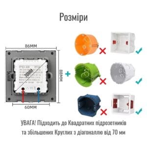 - Минимальная внутренняя диагональ совместимого подрозетника: 70мм