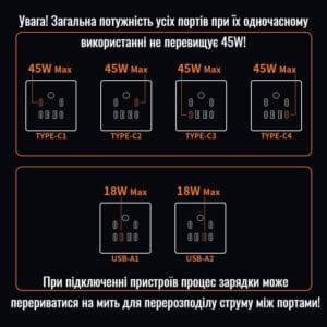 - Обеспечивает мощность USB выходов до 45W для быстрой и эффективной зарядки для ваших устройств.