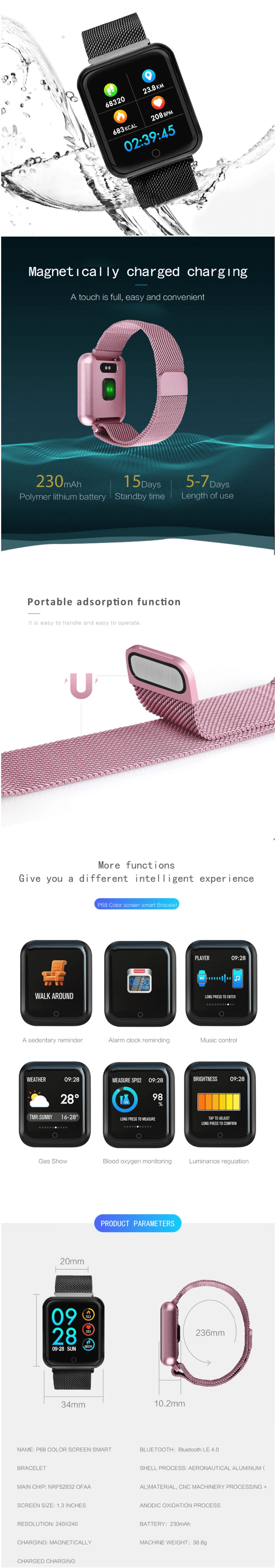 Смарт-часы P68 это современные часы c функцией измерения давления, пульсометром, шагомером, с высококачественным IPS экраном, а также с водонепроницаемостью по стандарту IP67, плавать и принимать ванну в часах нельзя. Система крепления ремешков стандартная и позволяет быстро их менять при необходимости. Сами ремешки при этом имеют ширину 20 мм, поэтому при необходимости ремешок можно заменить на любой другой.