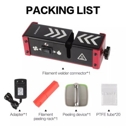 Комплектация прибора позволяет произвести соединение даже пользователям с минимальным опытом. Кроме сварочного аппарата, в комплект входит 21 отрезок тефлоновой трубки, держатель для нити и инструмент для зачистки филамента после сварки.