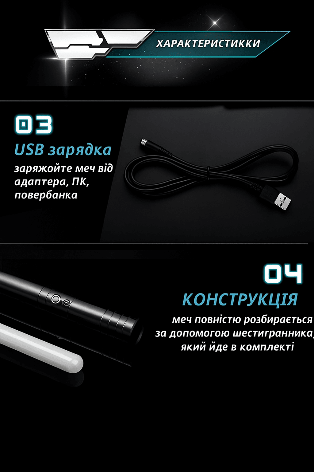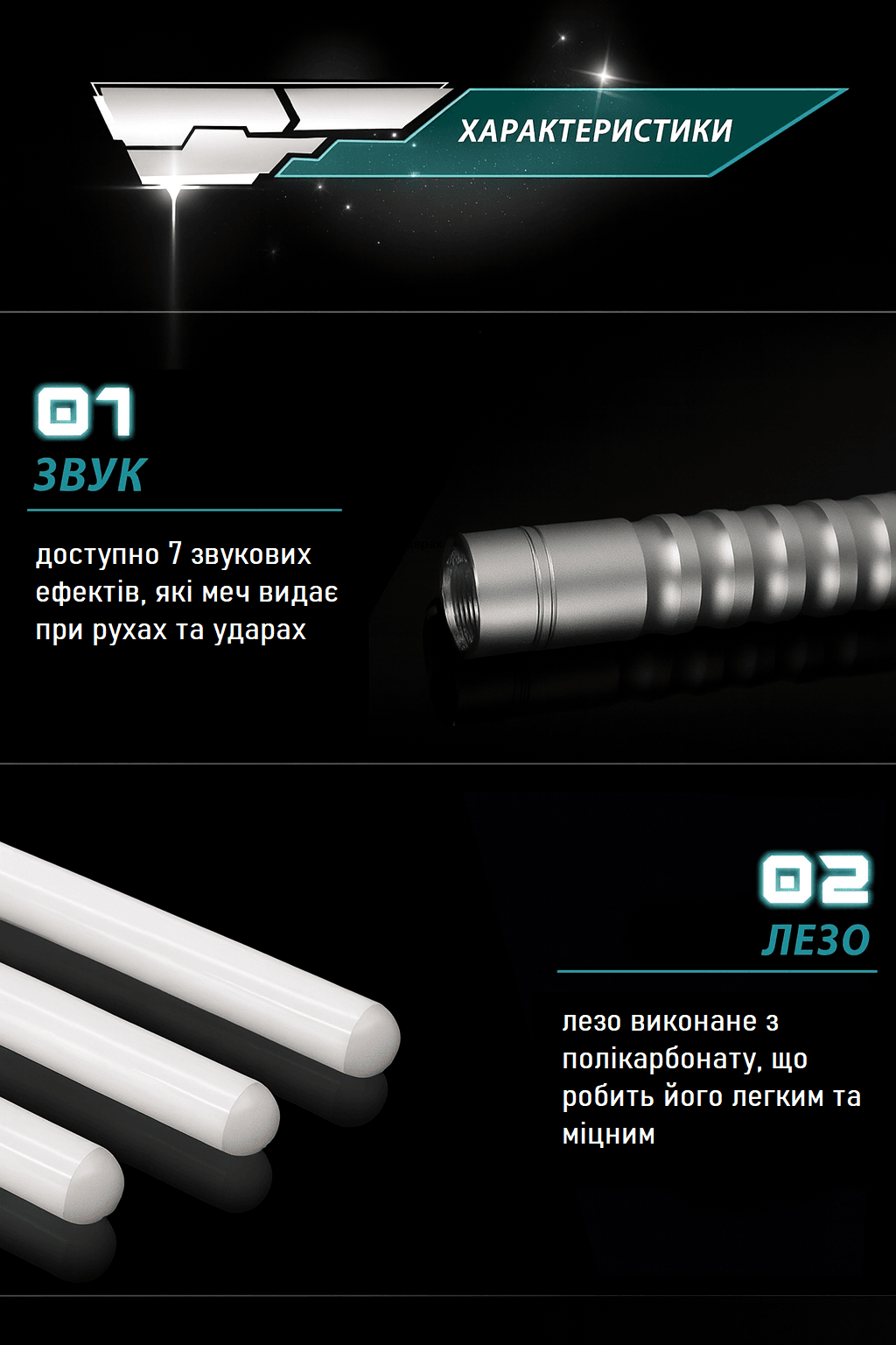 - Включение звуковых эффектов: после отключения питания нажмите кнопку в течении 3 секунд (лезвие/кнопка мигнет дважды), а затем отпустите ее, чтобы включить/выключить эффекты. Для изменения эффекта зажмите кнопку на 1 сек, а за тем включите меч. Доступно 7 эффектов, каждый эффект озвучивается английской цифровой.
