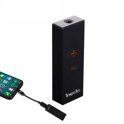 USB ЦАП имеет металлический корпус и очень маленький размер. На корпусе есть название бренда TempoTec и две кнопки регулировки громкости, причем, самой громкости у устройства тоже две: та что регулируется на смартфоне и своя собственная, которую мы и меняем кнопками. При изъятии наушников устройство автоматически выключится, а если вставить наушники в гнездо- включается.