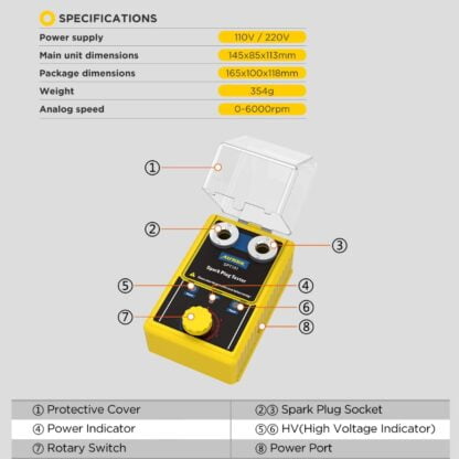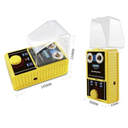 Продукт успешно имитирует фактические условия двигателя и работает до 6000 об/мин. Он совместим с двигателями коленного вала и двигателями мотоциклов.. Он также может тестировать одну либо две свечи зажигания одновременно. Корпус выполнен из качественного пластика. Тестер разработан с защитной крышкой для безопасной эксплуатации. Индикаторы, 2 отверстия для свечей зажигания и регулятор частоты высоковольтного напряжения находятся на передней панели прибора