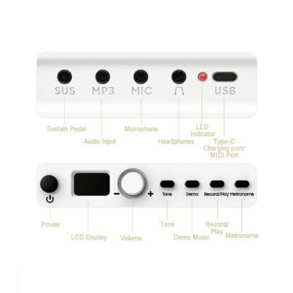 - Порты: MIDI OUT, порт для наушников, порт для микрофона, педаль сустейна, порт Type-C