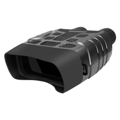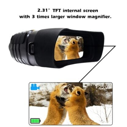 Бинокль NightVision отличается прочной и эргономичной конструкцией. Он выполнен из высококачественного ABS-пластика, который может выдержать случайные удары. Прорезиненные вставки помогают крепко удерживать бинокль. В верхней части устройства расположены кнопки управления. Полученная картинка выводится на экран диагональю 2,31″, который дает возможность хорошо рассмотреть детали изображения. К дополнительным преимуществам экрана относятся увеличивающая линза и резиновая окантовка. На экране отображается режим съемки и индикатор заряда батареи. Также Вы можете отрегулировать оптическую подстройку, настроив резкость деталей для более четкого и информативного изображения.