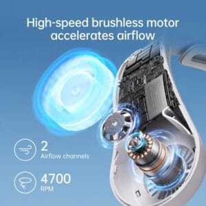 - Эргономичность. Обновленный дизайн, точно повторяющий изгиб шеи, обеспечивает комфортное ношение в течение длительного времени: вентилятор надежно фиксируется на шее, не скользит и не запутывает волосы.