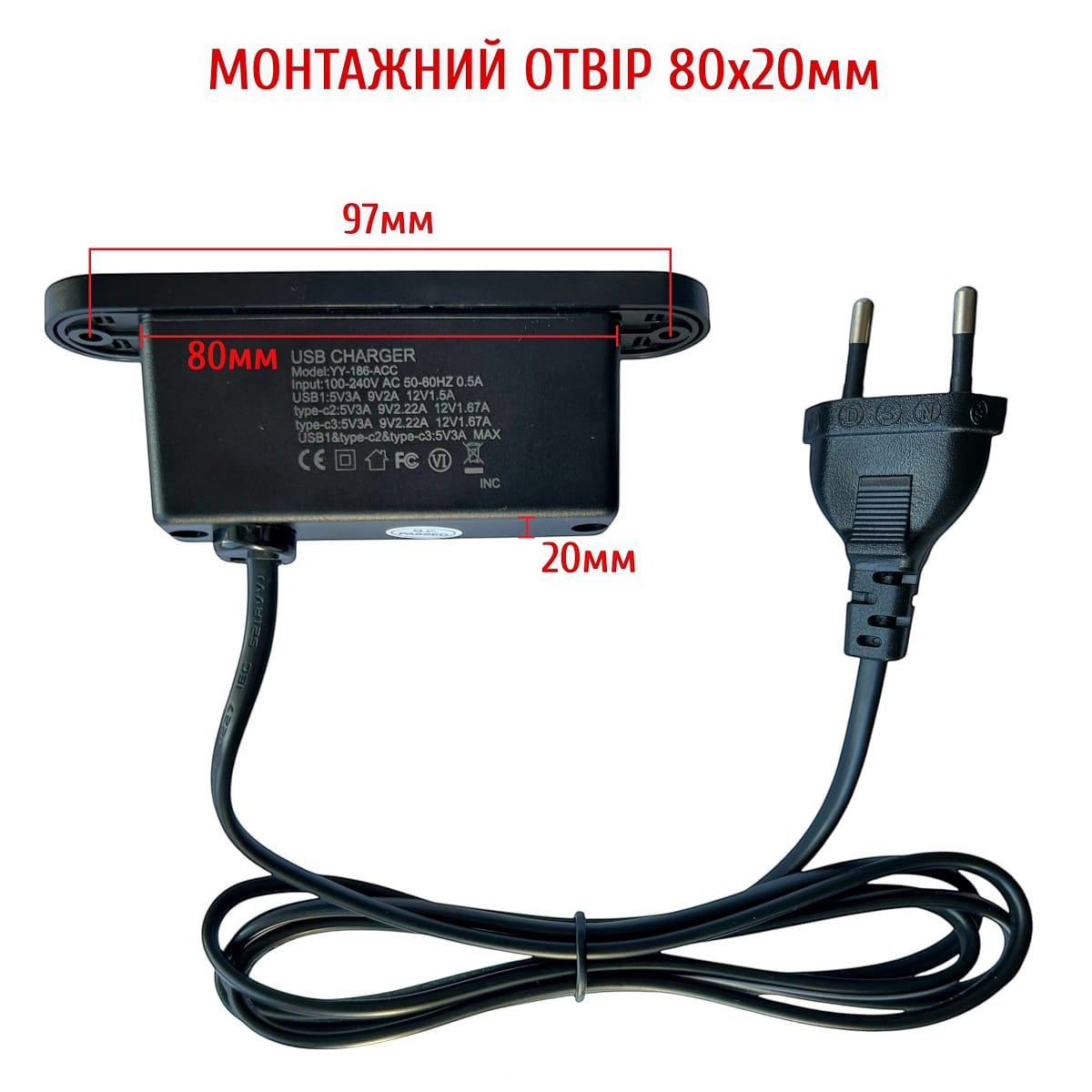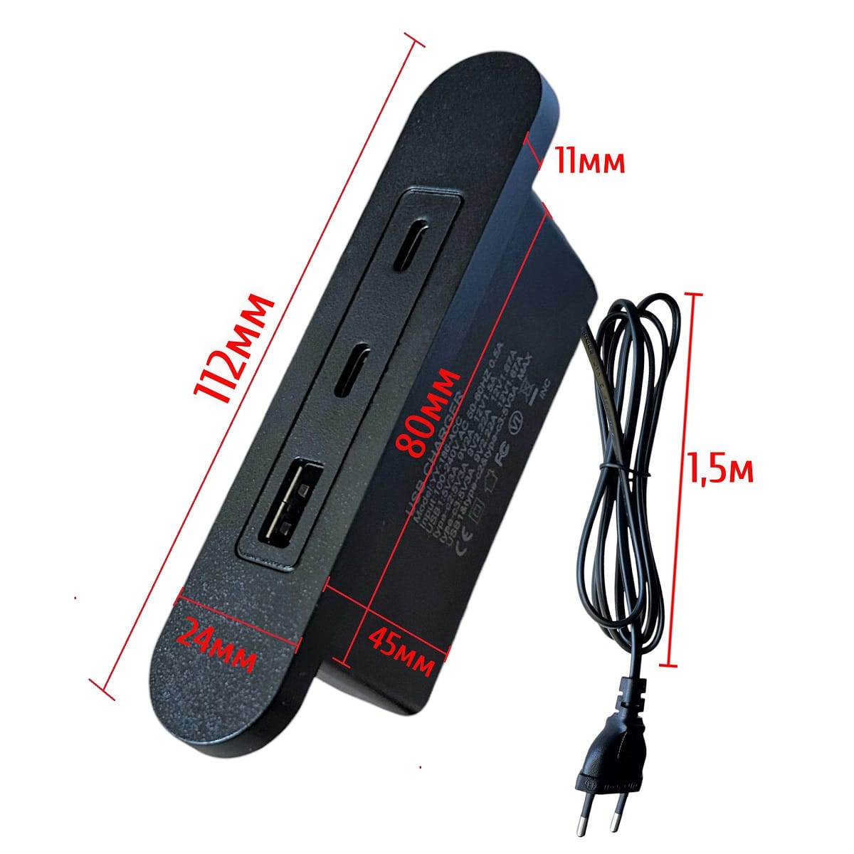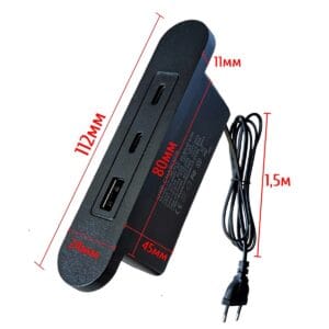 - Преобразует переменный ток из сети (100-240 В) в постоянный ток для USB-устройств: 5 В, 9 В, 12В.