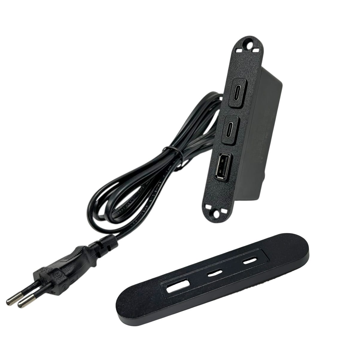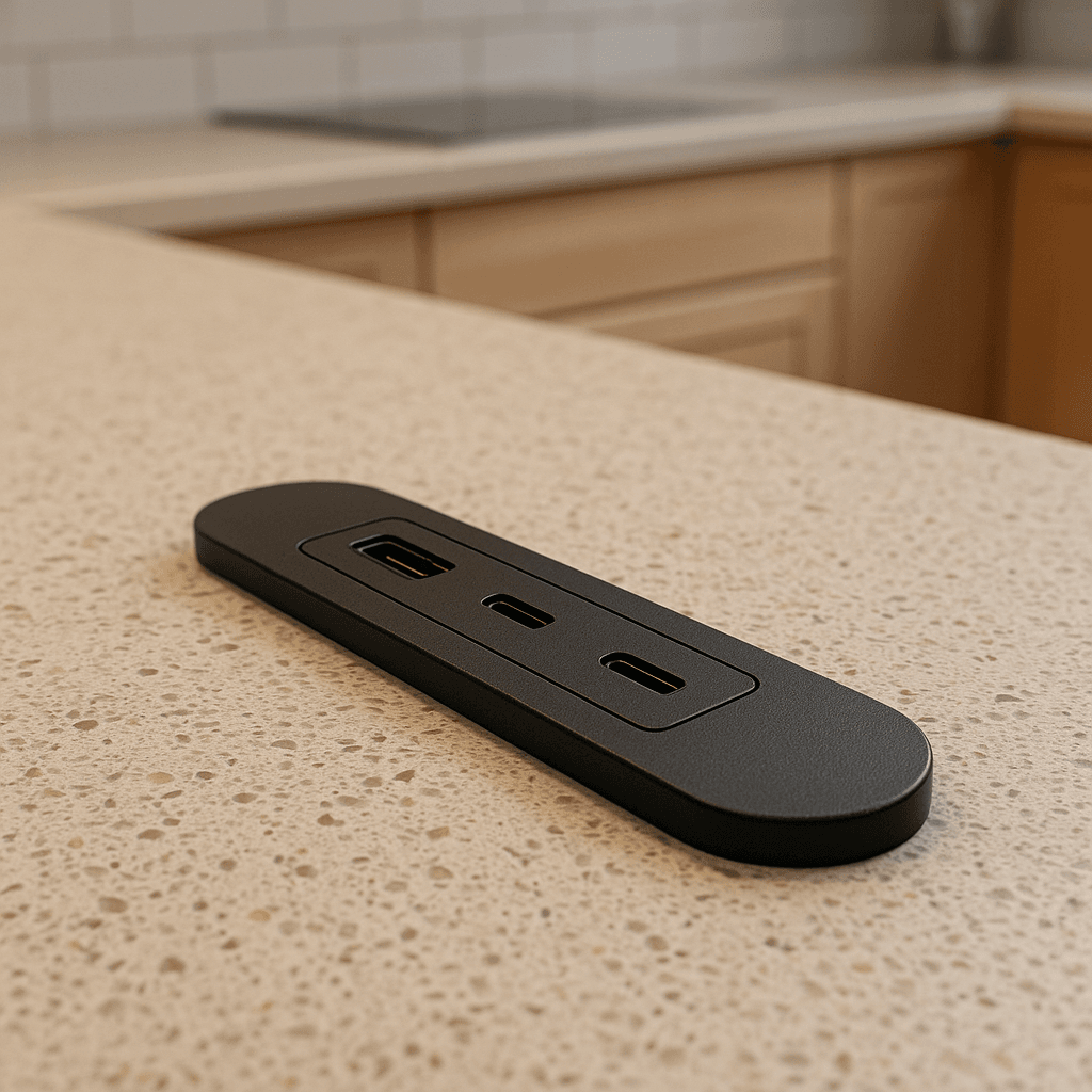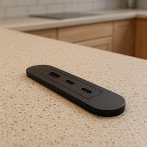 - Встраиваемый блок питания с портами USB из качественного пластика, предназначенный для установки в мебель или столешницу.