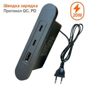 - 1 порт USB-A, который выдерживает зарядный ток до 3 А. 2 порта USB-C, которые обеспечивает быструю зарядку PD 20 W, и выдерживают зарядной ток до 3А.