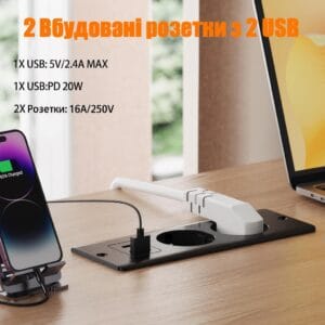 - Врезная розетка: больше никаких громоздких адаптеров и запутанных кабелей. Занимает меньше места на столе и помогает организовать пространство наилучшим образом.
