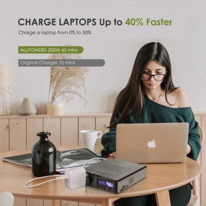 - Портативная электростанция ALLPOWERS оснащена 1 розеткой переменного тока (220 В 200 Вт), 2 портами USB-A и портом Type-c, специально разработанным для зарядки ноутбуков, iPad, дронов и другой электроники.