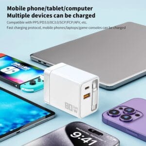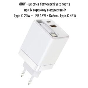 - Мощьность (сума мощтностей всех портов при отдельном использовании):80 Вт