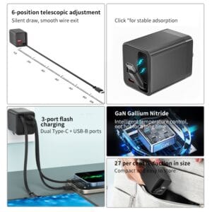 - Характеристики выдвижного кабеля: 45W, 5V/3A, 9V/3A, 12V/3.75A, 15V/3A, 20V/2.25A, PPS1;5-21V/2.14A