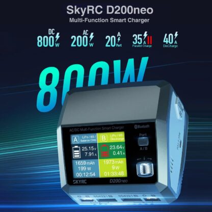 Зарядное устройство SkyRC D200Neo разумно и динамично распределяет зарядную мощность, когда оба порта работают одновременно. Когда активен только один порт, D200neo направляет всю свою мощность на этот порт, обеспечивая оптимальную и быструю зарядку. Кроме того, D200Neo предлагает гибкость выбора между переменным и постоянным током. В режиме переменного тока обеспечивает мощность зарядки до 200 Вт, а в режиме постоянного тока эффективность повышается до 800 Вт.