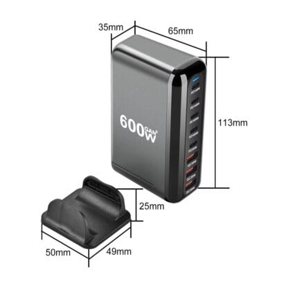 Зарядное устройство YMX 600W, GaN, PD 140W, QC 30W – очень мощное универсальное зарядное устройство с общей максимальной мощностью зарядки 600 Вт и технологией Power Delivery (PD140). Главное отличие этого зарядного устройства – наличие супермощного разъема Type-C – PD140 ватт для быстрой зарядки ноутбуков. Совместимо с различными устройствами USB и USB-C, такими как iPhone, смарт-часы и планшеты, обеспечивая эффективную зарядку независимо от габаритов, емкости батареи и других особенностей, подходит для устройств Apple и Android.